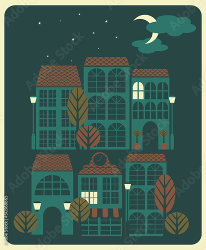 Night time neighborhood landscape. Town houses and big city on the background. Window light