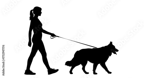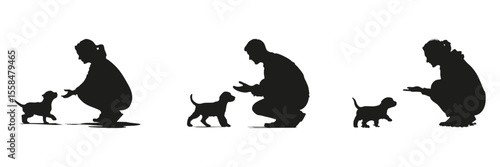 Silhouette of a person teaching a dog obedience training commands against a white background