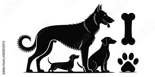 Vector silhouettes of girl with her dogs on white background. Symbol of pets and canine.