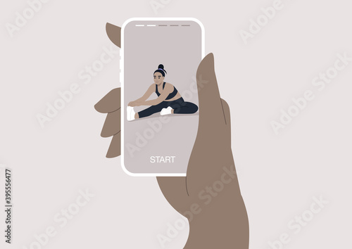 A mobile online workout session, a young female Asian character doing a hamstring stretch, sport and well being