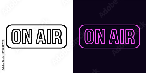 Outline neon On Air text, icon set. Glowing neon On Air sign with frame. Broadcast music radio, tv show and podcast. Online sport game stream, live play. News on air, live interview. Vector icons