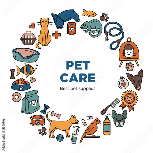 Pets, love home animals doodle concept with domestic cat, dog, parrot, rabbit with turtle or fish in aquarium. Food bowl, comb, scissors and leash, bone, cosmetics bottles, Linear vector illustration