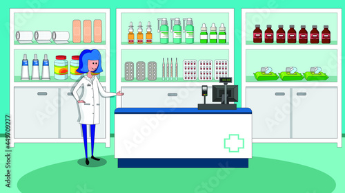 Healthcare Vector Pharmacy vector representation of a modern pharmacy with shelves of medicines, a counter, and a pharmacist.