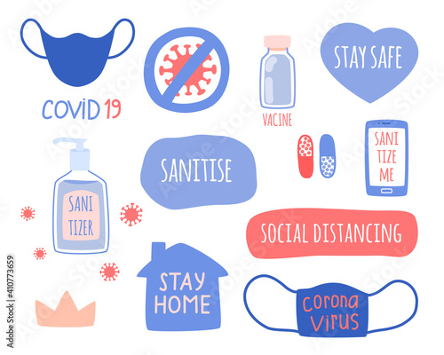 Set of people prevent covid-19 by wearing face mask, washing hands, using hand sanitizer and disinfect touched devices. Concept of virus prevention, protection, health care. Flat vector illustration.