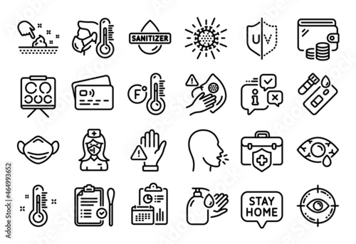 Set of Healthcare outline icons. Contains icons as Electronic thermometer, Cardio training and No alcohol elements. Wash hand, Pets care, Oil drop web signs. Hand sanitizer. Vector
