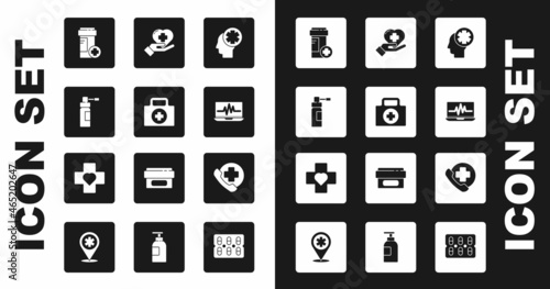 Healthcare icon set. Containing treatment, prevention, medical, health, diagnosis, report, illness, injury and more. Solid vector icons collection.