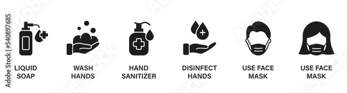 Use Sanitizer, Soap, Disinfect, Face Mask for Prevent Infection Silhouette Icon Set. Pandemic Coronavirus Safety Glyph Pictogram. Medical Respiratory Flu Virus Icon. Isolated Vector Illustration