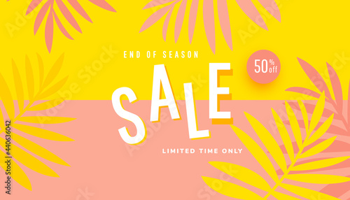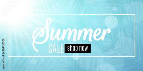 Summer sale vector illustration with tropical leaves background. Promotion banner for website, flyer and poster.