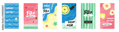 Summer sale stories banners background template set. Beach and sea design for stories and posters. Summer design with summer elements and silhouettes. Abstract vector summer sale stories.