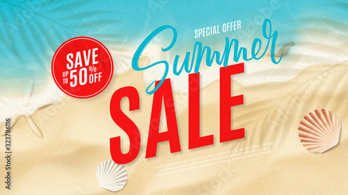 Summer sale horizontal web banner. Top view on sea beach with soft waves. Vector illustration with plant's shadows. Beautiful background with seashells on sea sand. Seasonal discount offer.