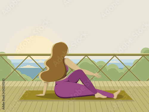 girl makes yoga with mountain view purple landscape and sunshine vector illustration EPS10