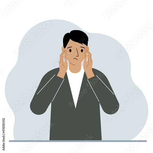 Unhappy man clutching his head with his hands. Emotions and body language concept. Stress, tension and migraine concept.