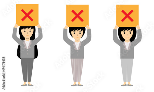 Woman holds a reject mark to protest or disapprove something. Activist female disagrees about new laws by saying NO or STOP. Voting, feedback, review and rejection concept. Vector illustration