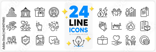 Icons set of Puzzle, Metro subway and Handbag line icons pack for app with Patient, Doctor, Wash hands thin outline icon. Circus tent, Report document, Business statistics pictogram. Vector