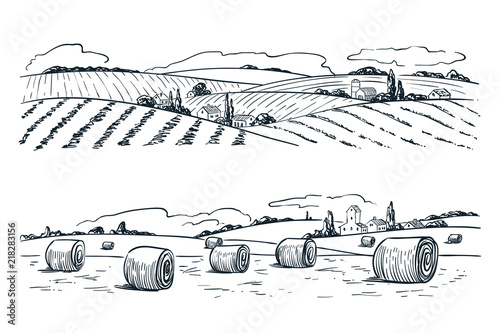 Countryside. Village field. Rural landscape. Contour vector line. Horizontal banner background. Hand drawn sketch. Open paths. Editable stroke.
