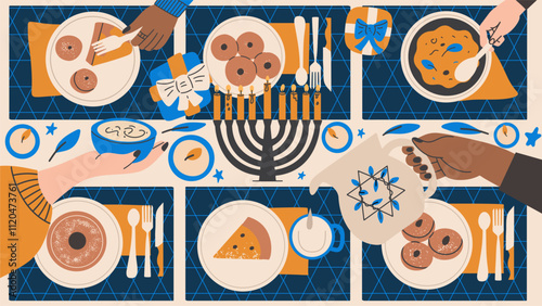 Hanukkah holiday celebration with traditional Jewish food, menorah candelabra. Festival latkes, dish, ceremony symbols, festive Hanuka meal. Flat vector illustration isolated on white background
