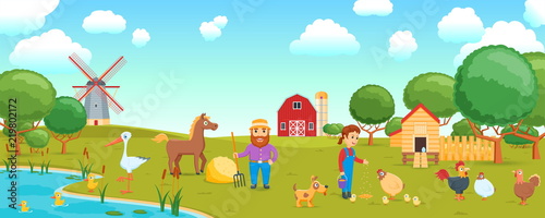 Farm background with barn and windmill, henhouse and farm animals in cartoon style for children books, posters or games