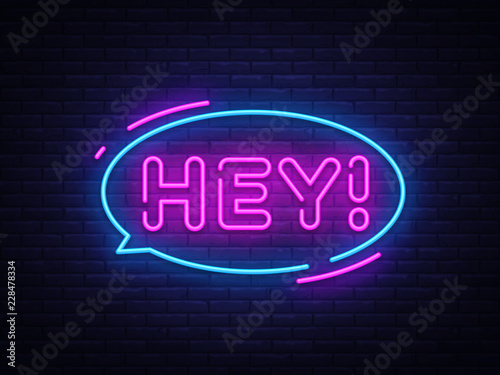 Neon sign hey . Set of neon speech bubbles and the alphabet on a dark background.