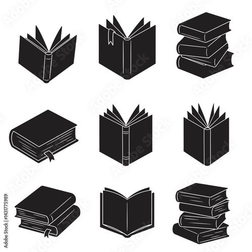 A comprehensive collection of minimalist black and white book icons, showcasing diverse open and closed designs, ideal for digital interfaces, educational materials, and academic projects