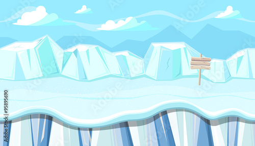 Vector illustration of the North Pole. Cartoon ice landscape with penguins, fur seal, eskimo needles of mountains backdrop.