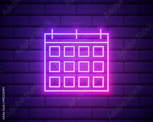 Calendar neon light line art vector icon. Outline symbol of event reminder. Schedule pictogram made of thin stroke. Isolated on brick wall background.
