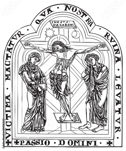 crucifixion of Jesus Christ on the cross, son of God, Christian religious symbol, Orthodox icon, vector illustration with black ink contour lines isolated on a white background in hand drawn style