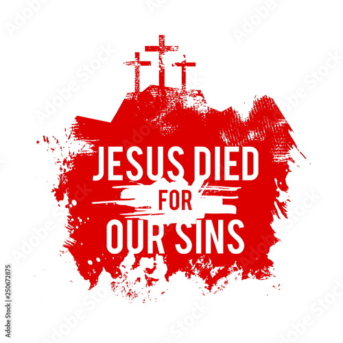Religious banner with crucified Jesus Christ, abstract black cross and red drops on the background of handwritten text Lorem ipsum. Abstract religion illustration with a crucifix in retro style