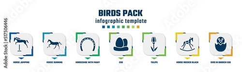 birds pack concept infographic design template. included horse jumping, horse running, horseshoe with many holes, egg, tulips, horse rocker black, bird in broken egg icons and 7 option or steps.