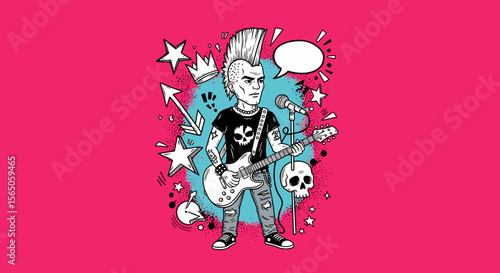 SVG of a rocker skeleton with a skull motif, perfect for edgy tattoo art. Skull with Mohawk Singing into Microphone in Punk Style Art