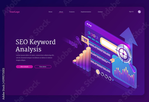 SEO keyword analysis banner. Research and analytics of search engine optimization of content. Vector landing page with isometric graphs, text on tablet screen and target