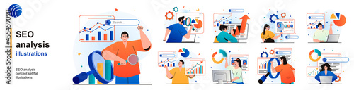 Seo analysis isolated set. Analyze data, successful strategy, optimization. People collection of scenes in flat design. Vector illustration for blogging, website, mobile app, promotional materials.