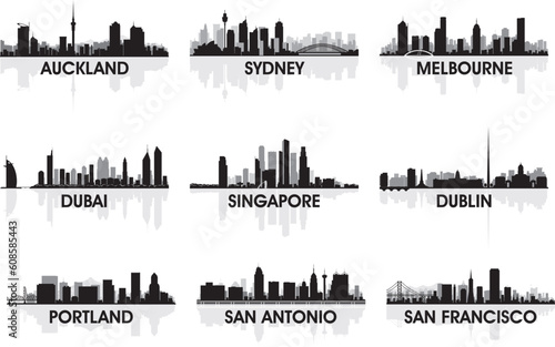 vector illustrations of Singapore, Kuala Lumpur, Sydney, Tokyo, Seoul, Beijing, Shanghai, Guangzhou and Hong Kong cities skylines