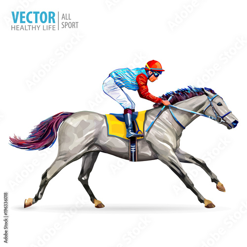 Jockey on horse. Champion. Horse riding. Equestrian sport. Jockey riding jumping horse. Poster. Sport background. Isolated Vector Illustration