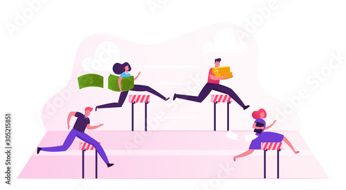 Business People Obstacle Race Website Landing Page. Managers Jumping over Barrier Wall on Stadium. Leadership Running, Colleagues Steeplechase Track Web Page Banner. Cartoon Flat Vector Illustration