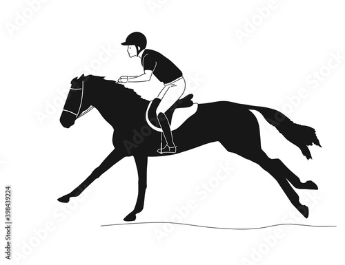 Jockey jumping over obstacle on horse in minimalist black and white line art style