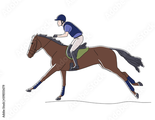 One single line drawing young horse rider man performing dressage jumping the obstacle test vector illustration graphic. Equestrian sport show competition concept. Modern continuous line draw design
