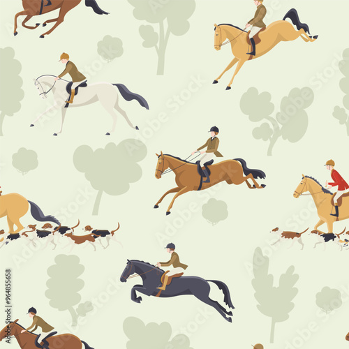 Seamless vector pattern, on the theme of hunting on horseback, riders riding and overcome obstacles accompanied by dogsSeamless vector pattern, on the theme of hunting on horseback, riders riding and