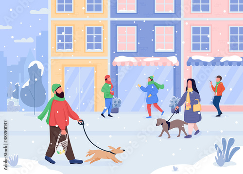 Walking dog in winter flat color vector illustration. Snowy weather. Light snowfall. Closed stores. Going out with pet. Christmas 2D cartoon characters with holiday city on background