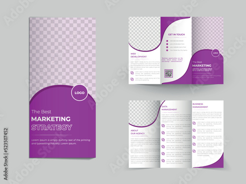 Corporate business trifold brochure template. Modern, Creative and Professional tri fold brochure vector design. Simple and minimalist promotion layout with purple color.