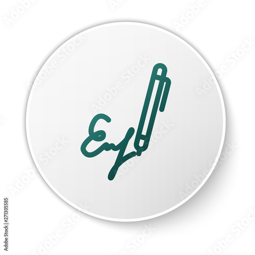 Green Signature line icon isolated on white background. Pen and undersign, underwrite, ratify symbol. White circle button. Vector Illustration