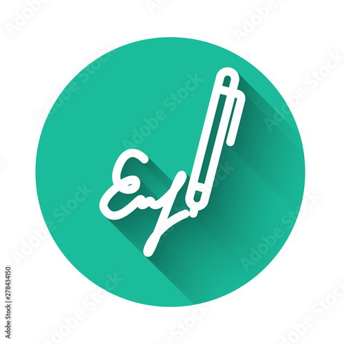 White Signature line icon isolated with long shadow. Pen and undersign, underwrite, ratify symbol. Green circle button. Vector Illustration