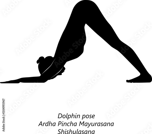 Silhouette of woman practicing Eka Pada Adho Mukha Shvanasana yoga pose. Three Legged Downward-Facing Dog pose. Isolated vector illustration