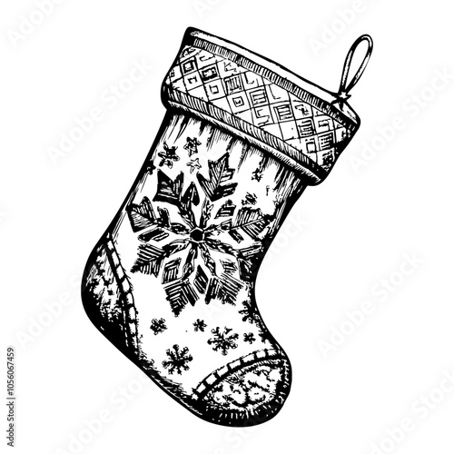 Christmas stocking with snowflake design and red trim on white background Keywords: christmas