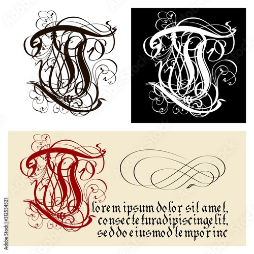 Intricate black calligraphic lettering design with gothic style font and decorative elements