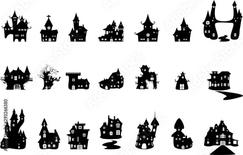 Spooky Haunted Mansion Silhouette with Bats and Twisted Trees.