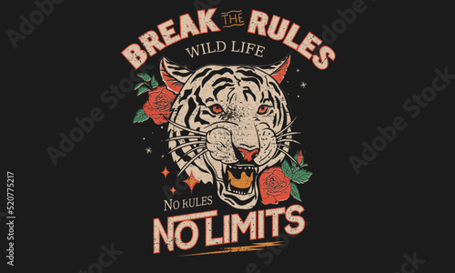 Breck the rules. Tiger face print design for t-shirt. Rock and roll vintage artwork for poster, sticker, background and others. Animal face. Wild life illustration.