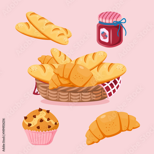 Bread loaves and baguettes in a vector illustration set. Includes details like a wheat sack, simple round shapes, and a classic bakery theme.