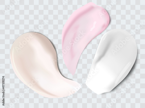 Pink foundation cream swatch, skincare cosmetic drops. Realistic 3d vector set of serum or lotion smears shapes and textures. Smooth, glossy strokes for beauty product presentations, skincare ads