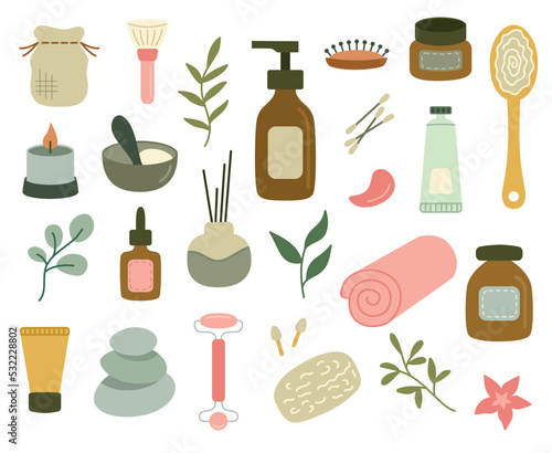 Spa relaxation and self care items set. Vector cartoon illustration of aromatherapy candle, oil, towel, tea, bath salt and sponge. Cozy wellness and body care concept.