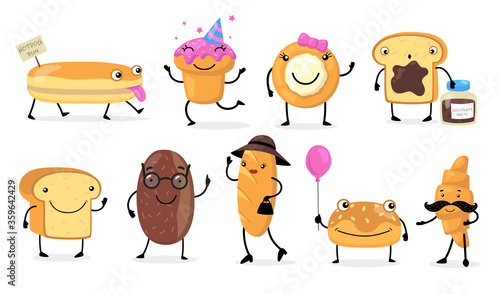 Cute bread characters vector cartoon set isolated on a white background.